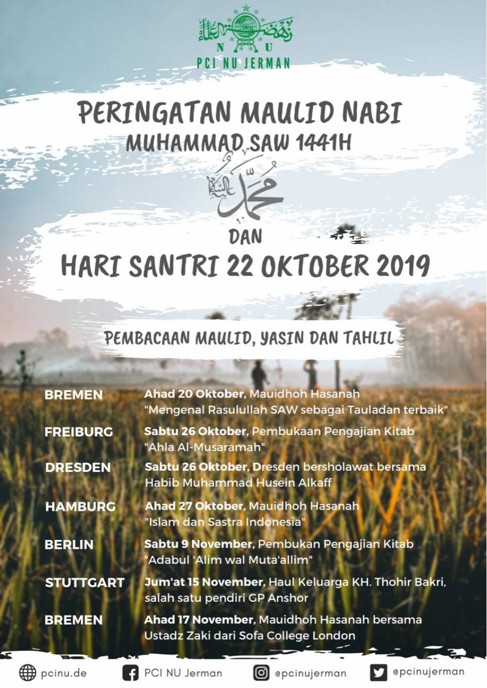 Berlin, Sabtu 9 November 2019 yang bertepatan dengan 12 Rabi’ul awwal 1441, hari kelahiran Nabi Muhammad SAW, menjadi catatan momentum sejarah yang penting bagi PCINU Jerman. Dalam rangka menyambut Maulid Nabi 1441 H dan hari Santri yang ke-74, PCINU Jerman bekerja sama dengan organisasi masyarakat Islam lokal Berlin Islamische Akademie Berlin e.V. menggelar perayaan Maulid Nabi SAW di sebuah ruangan milik Oganisasi Masyasarakat Pemuda Muslim Mancanegara bernama I,Slam.